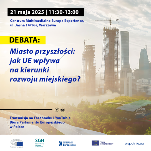 W imieniu Biura Parlamentu Europejskiego w Polsce, Szkoły Głównej Handlowej, Studenckiego Koła Naukowego Unii Europejskiej SGH i sieci eksperckiej Team Europe Direct przy Przedstawicielstwie Komisji Europejskiej w Polsce serdecznie zapraszamy na debatę hybrydowa pt. ,,Miasto przyszłości: jak Unia Europejska wpływa na kierunki rozwoju miejskiego?”.