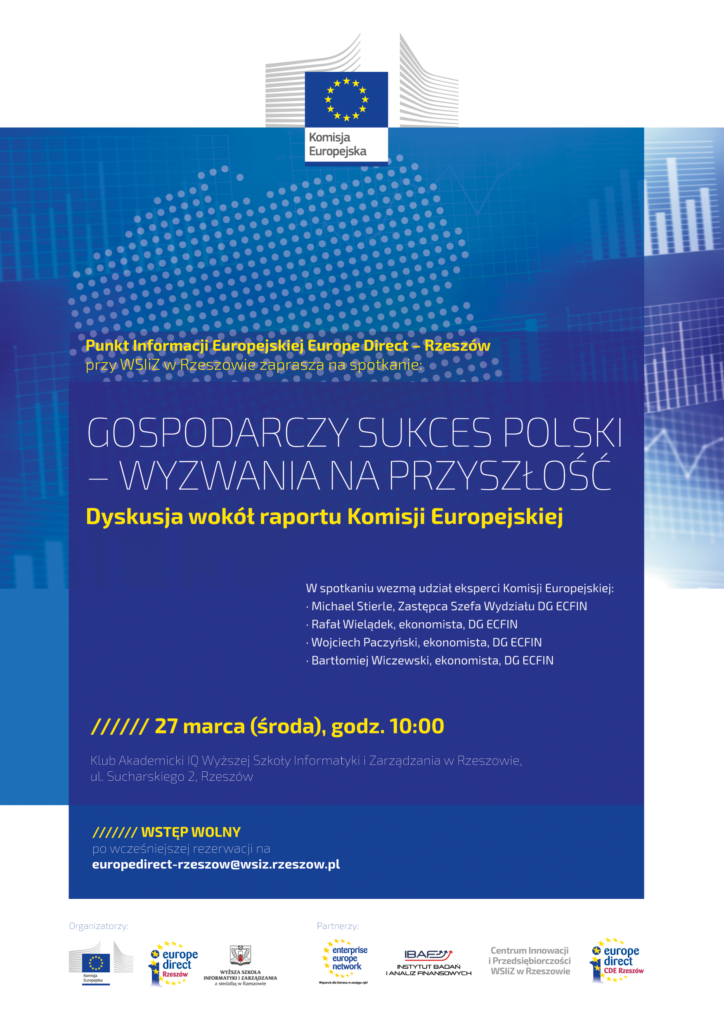 Aby przybliżyć mieszkańcom Podkarpacia kwestie związane z raportem, PIE ED Rzeszów zaprasza na spotkanie „GOSPODARCZY SUKCES POLSKI – WYZWANIA NA PRZYSZŁOŚĆ. Dyskusja wokół raportu Komisji Europejskiej”, które odbędzie się 27 marca br. o godz. 10:00 w klubie akademickim IQ WSIiZ w Rzeszowie.W spotkaniu w Rzeszowie wezmą udział następujący eksperci Komisji Europejskiej: Michael Stierle, Zastępca Szefa Wydziału w Dyrekcji Generalnej ds. Ekonomicznych i Finansowych (DG ECFIN); Rafał Wielądek, ekonomista, DG ECFIN; Wojciech Paczyński, ekonomista, DG ECFIN, Bartłomiej Wiczewski, ekonomista, DG ECFIN. Spotkanie obejmie prezentację raportu, a następnie sesję pytań i odpowiedzi.